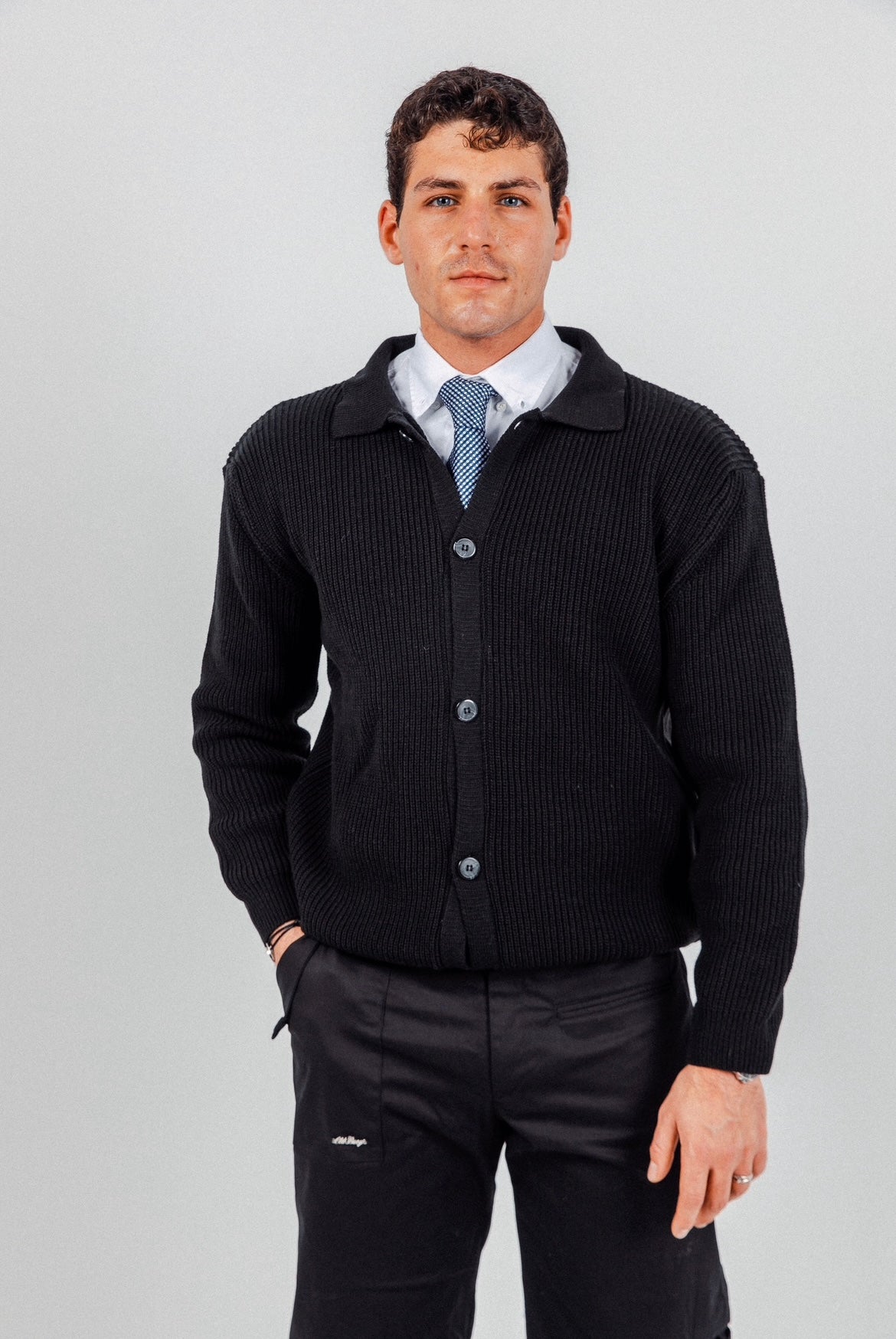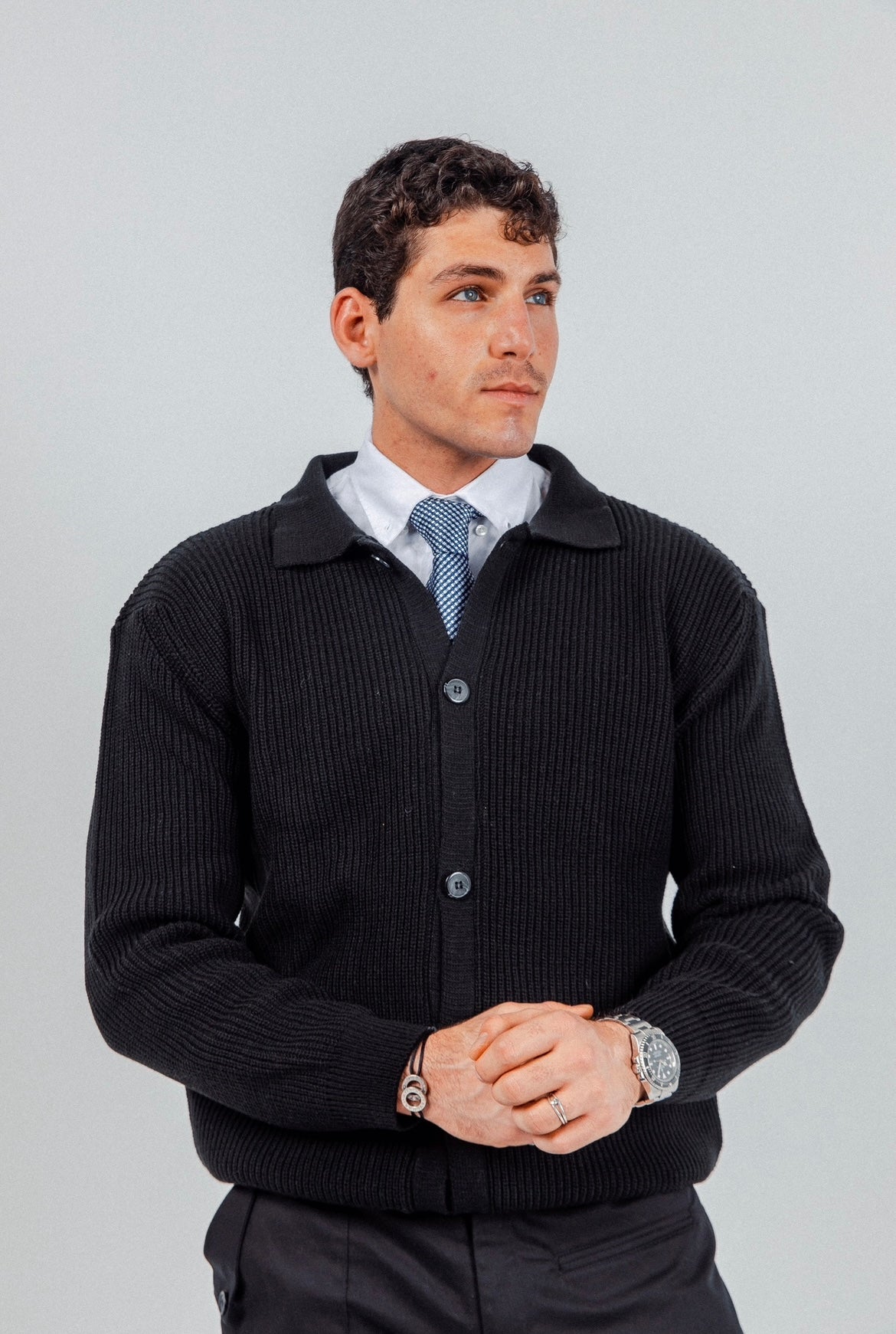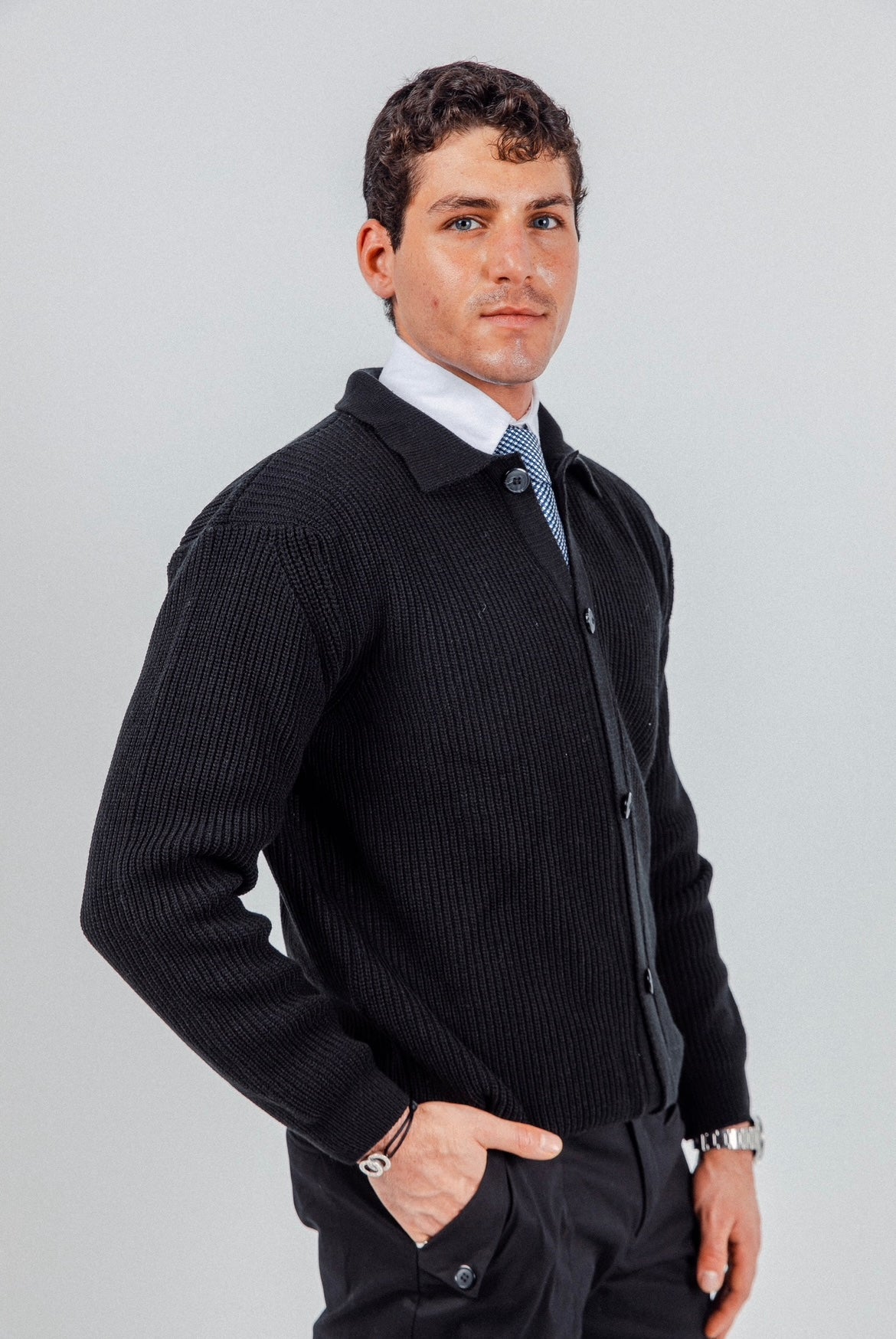 Regular fit cardigan knitted in wool yarn. Lapel collar and long sleeves. Ribbed trims. Button fastening at the front.